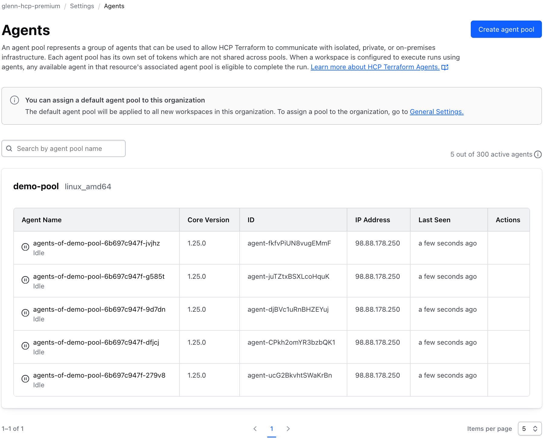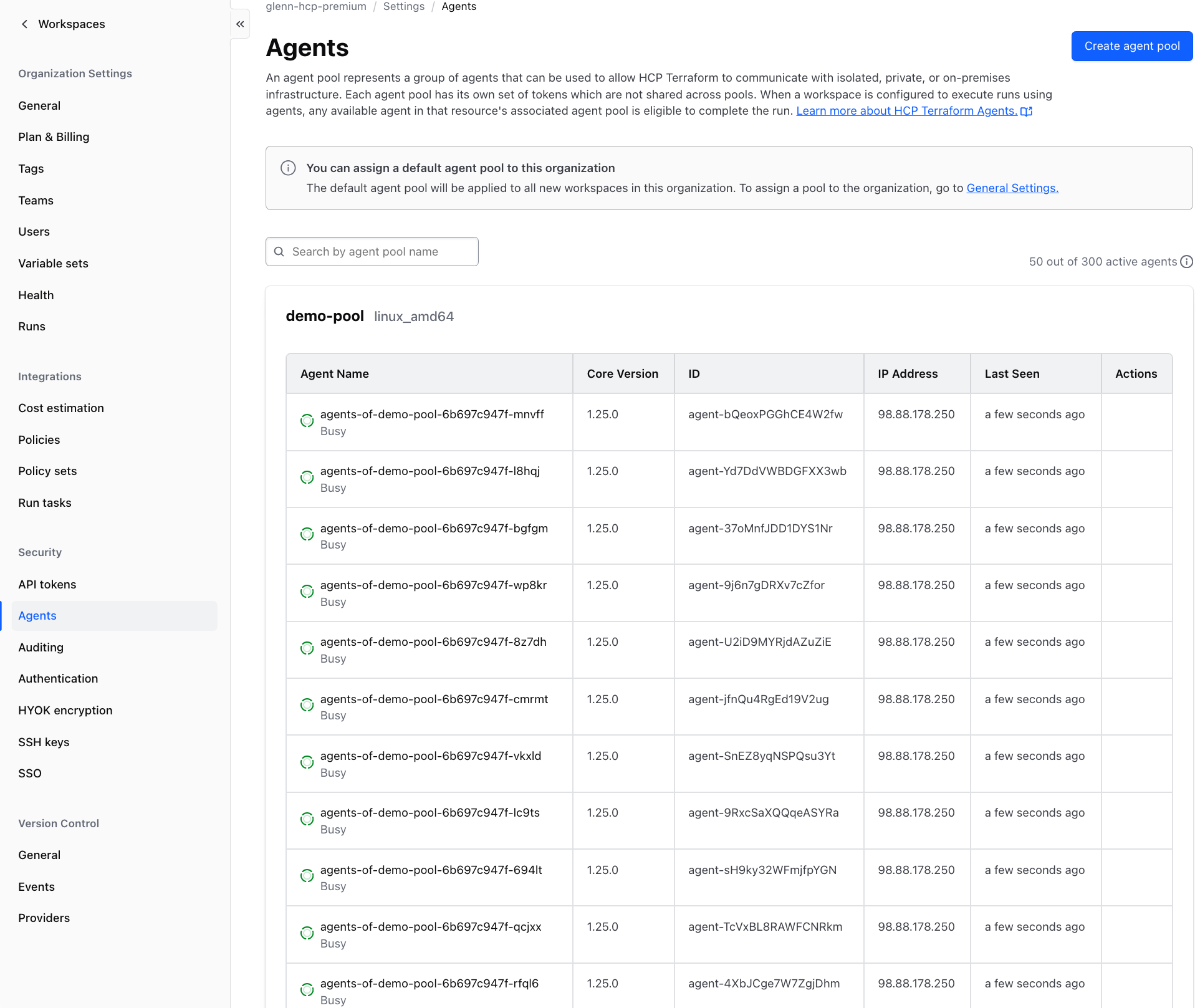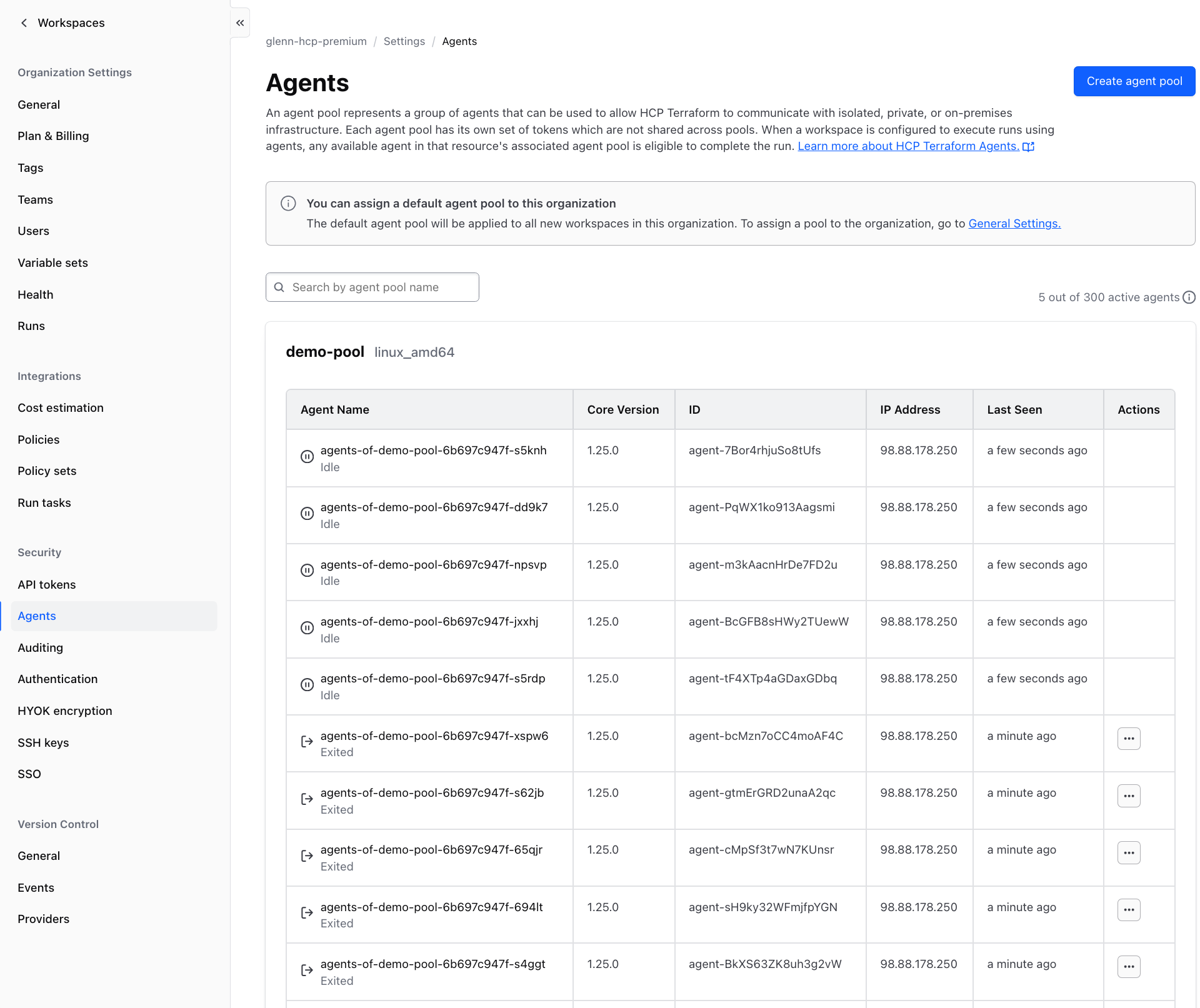 The code for this section is available here. Follow the instructions to create the operator agent pool CRD. For this demo, the Terraform agent pool is configured with minReplicas as 5 and maxReplicas as 50. These settings are compatible with agents running on HCP Terraform Premium, which supports up to 300 self-hosted agents. If you are using HCP Terraform Essentials or Standard, you should modify these values to align with your plan’s agent limits.