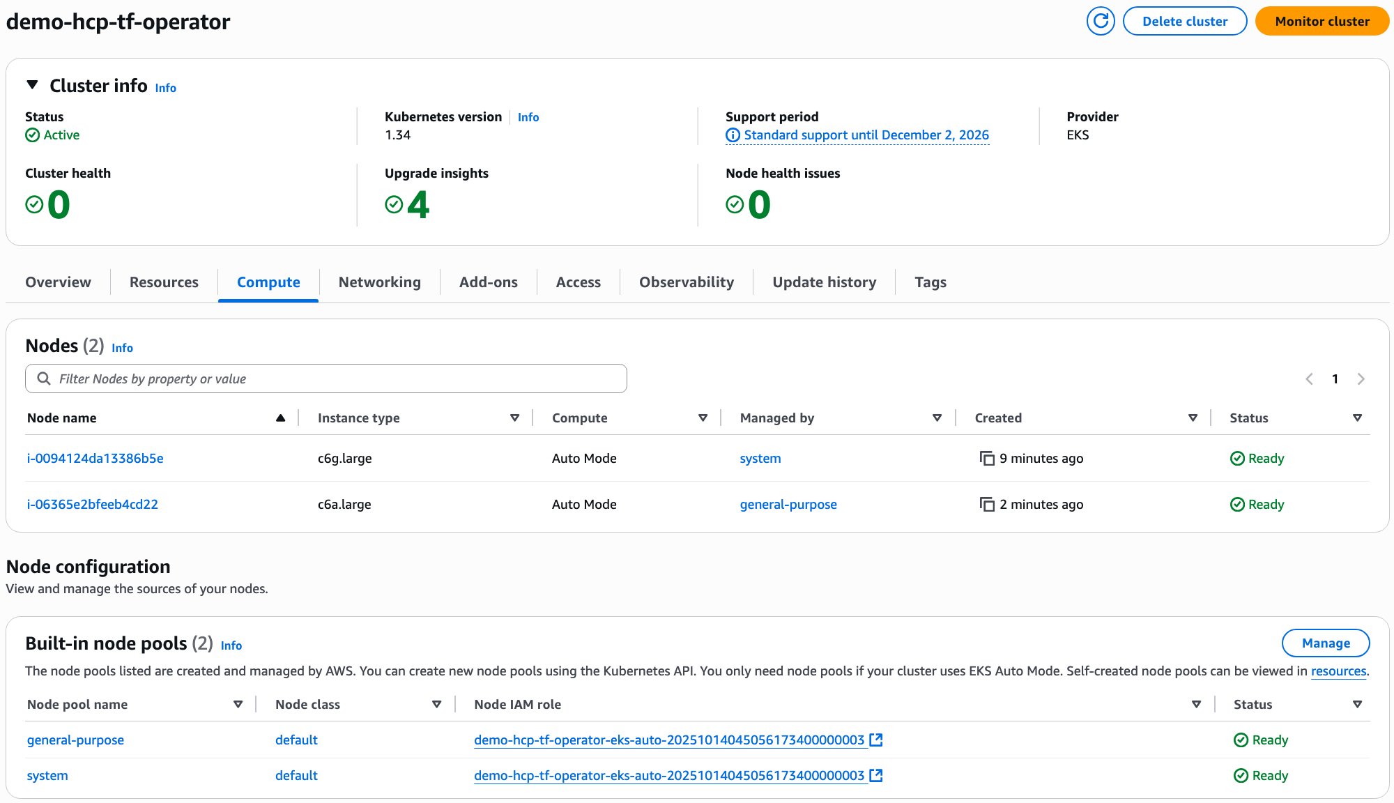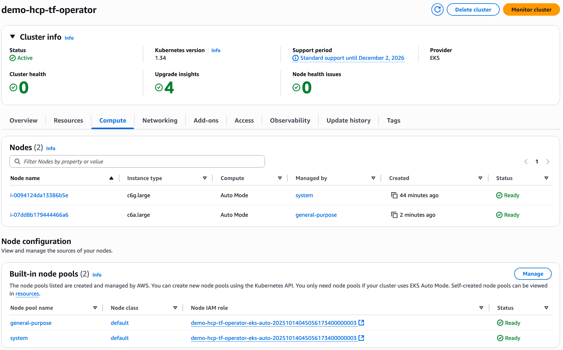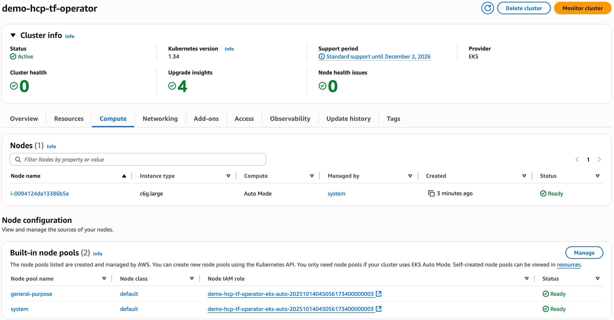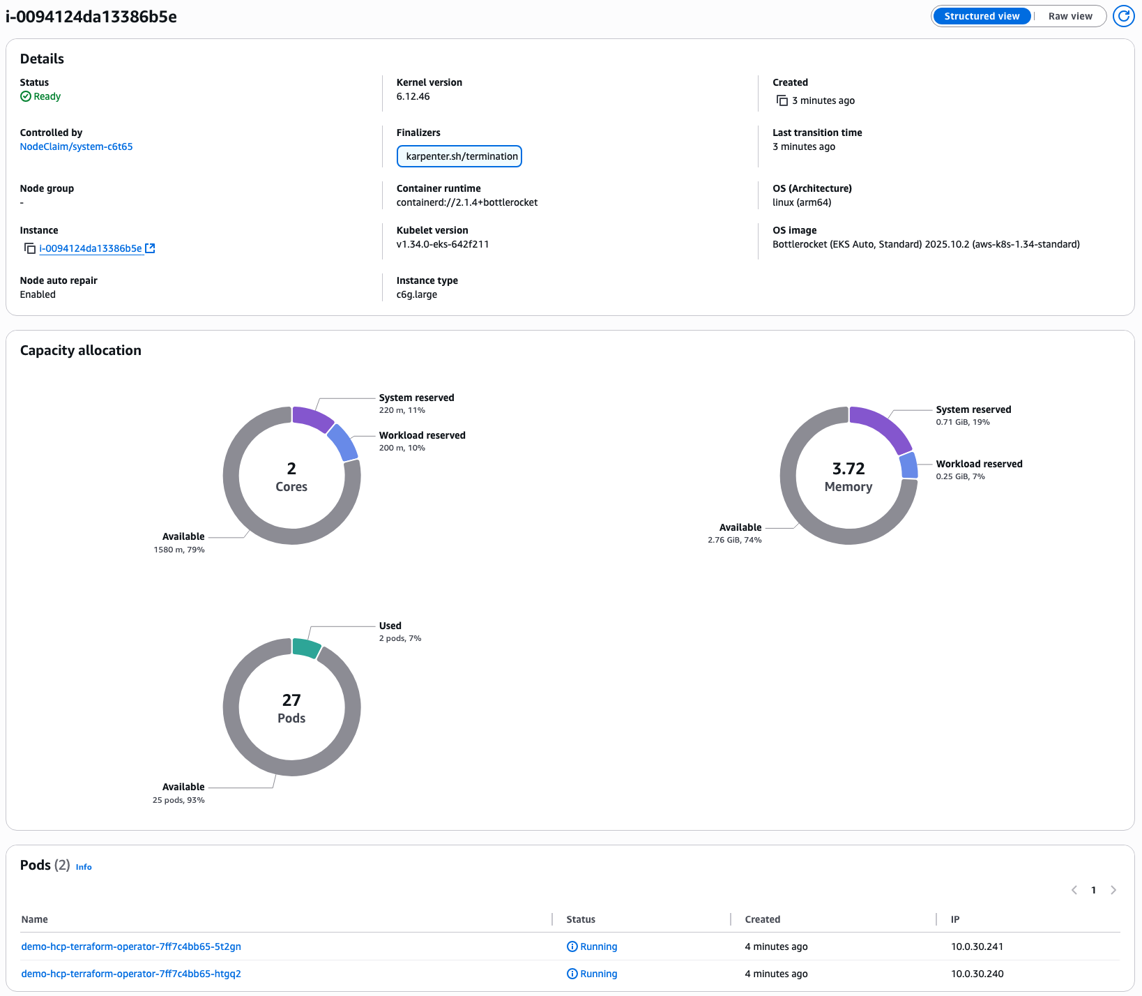 When the agent pods are created, EKS Auto Mode provisions a new node within the cluster to accommodate them, as the Terraform agent pods are scheduled onto the general-purpose built-in node pool.