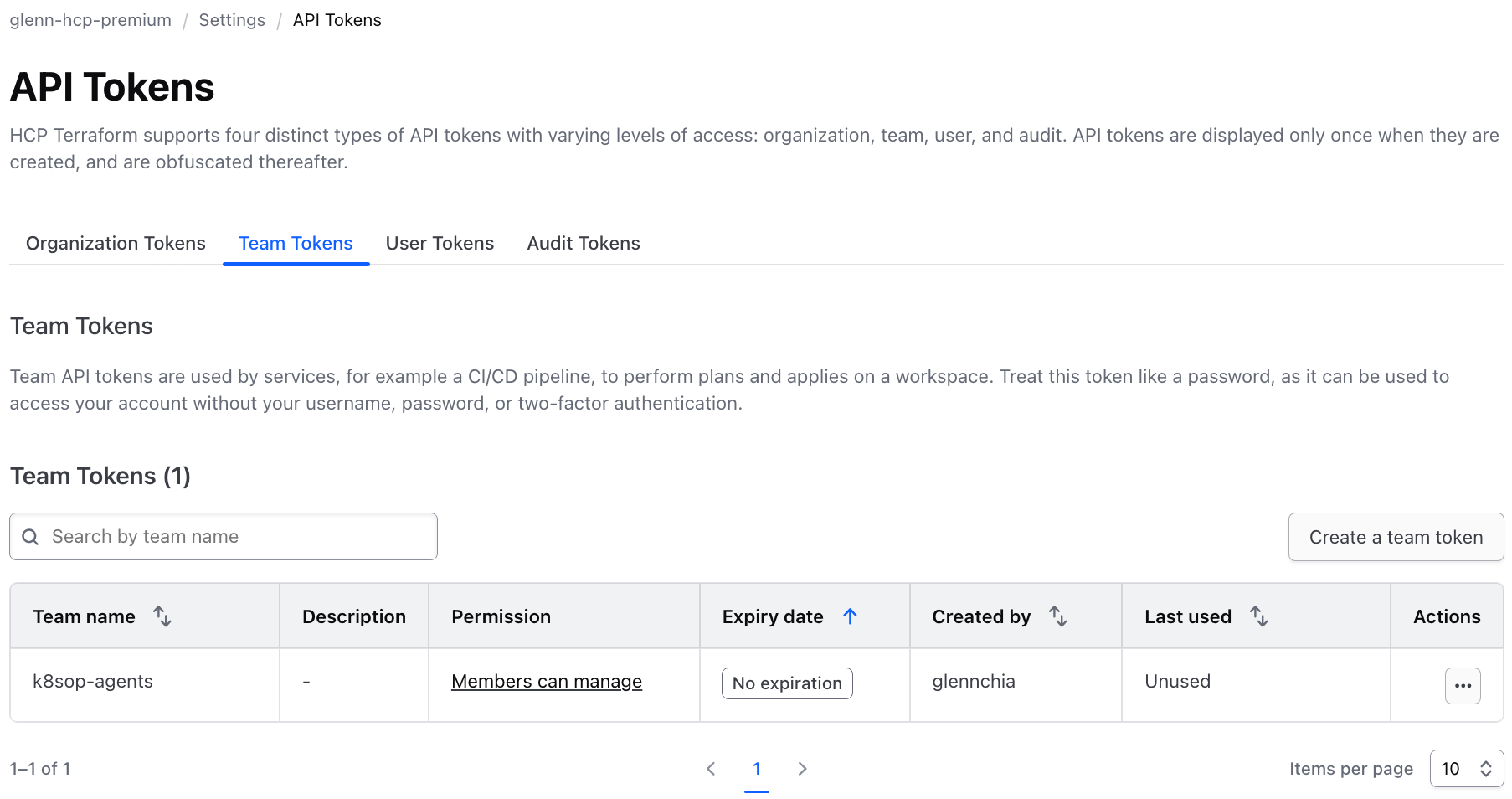 This creates a Terraform team named k8sop-agents with permissions to manage agent pools and read workspaces. These permissions are necessary because the Agent Pool Custom Resource Definition (CRD) requires the ability to create agent pools and detect pending runs in Terraform workspaces to effectively scale agents within the pool.