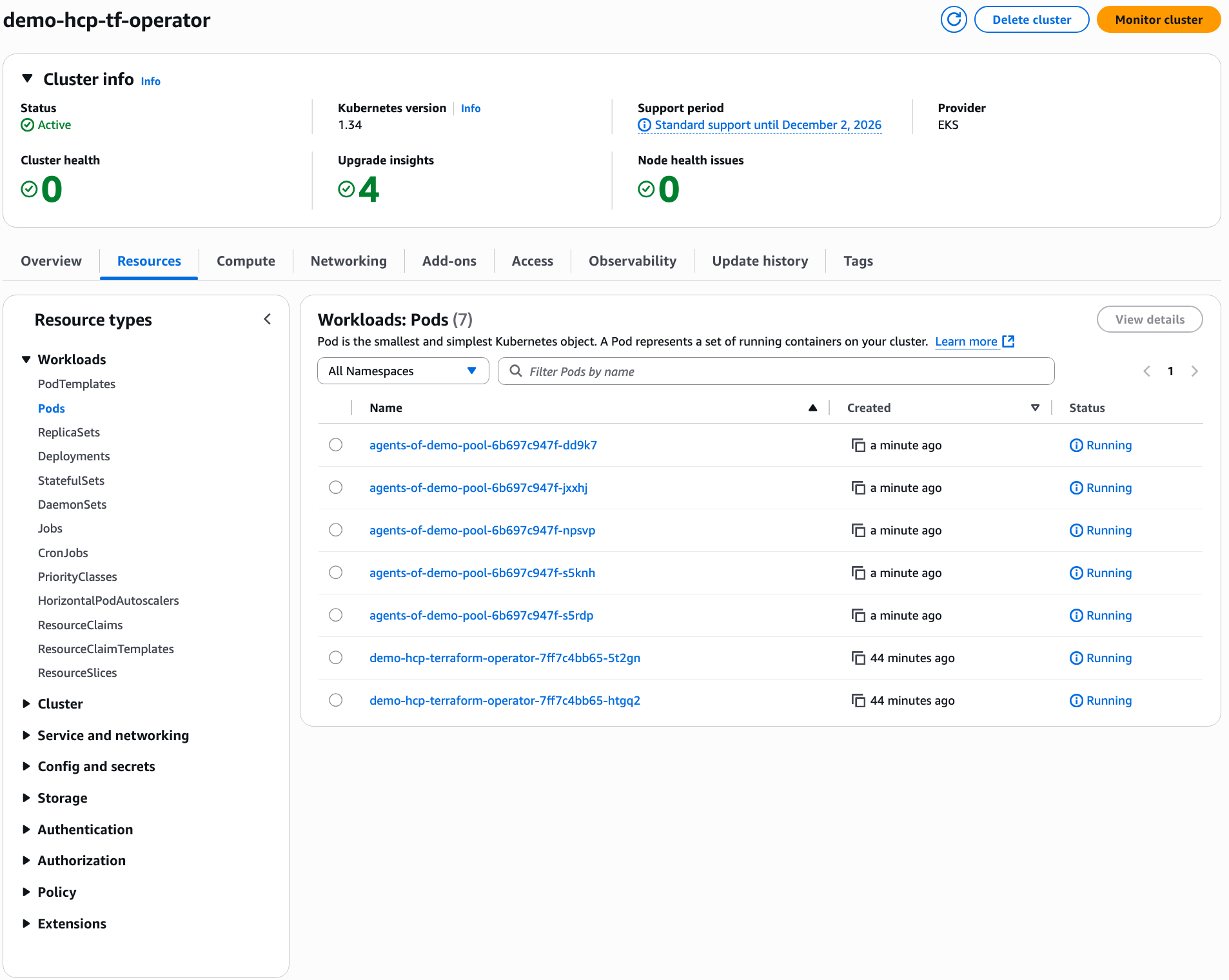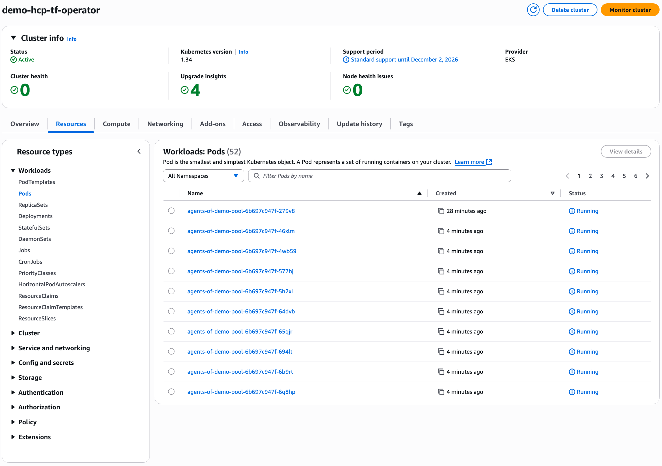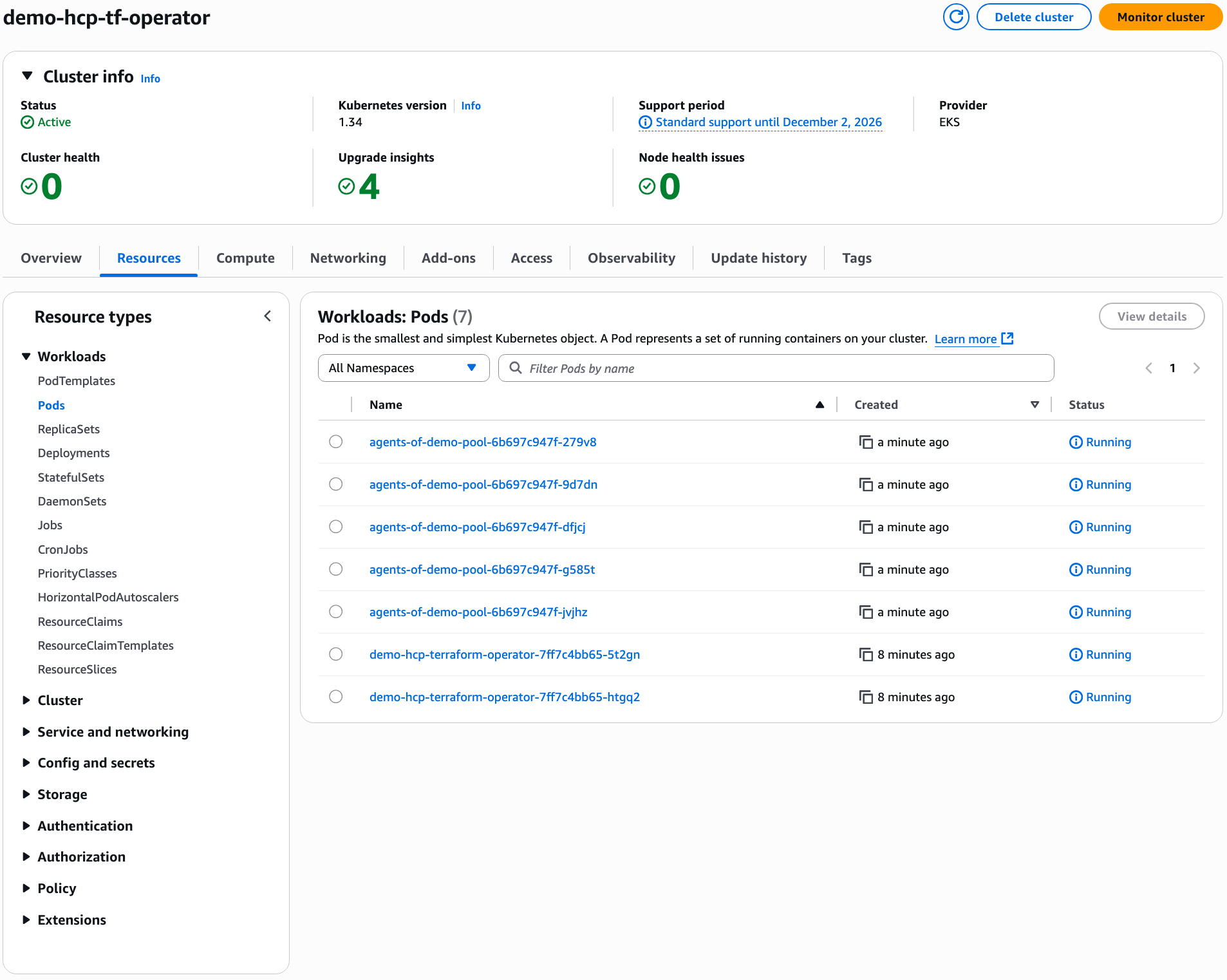 5 Terraform agent pods prefixed with agents-of-demo-pool are created in the EKS cluster. This is in addition to the original 2 HCP Terraform operator pods prefixed with demo-hcp-terraform-operator.