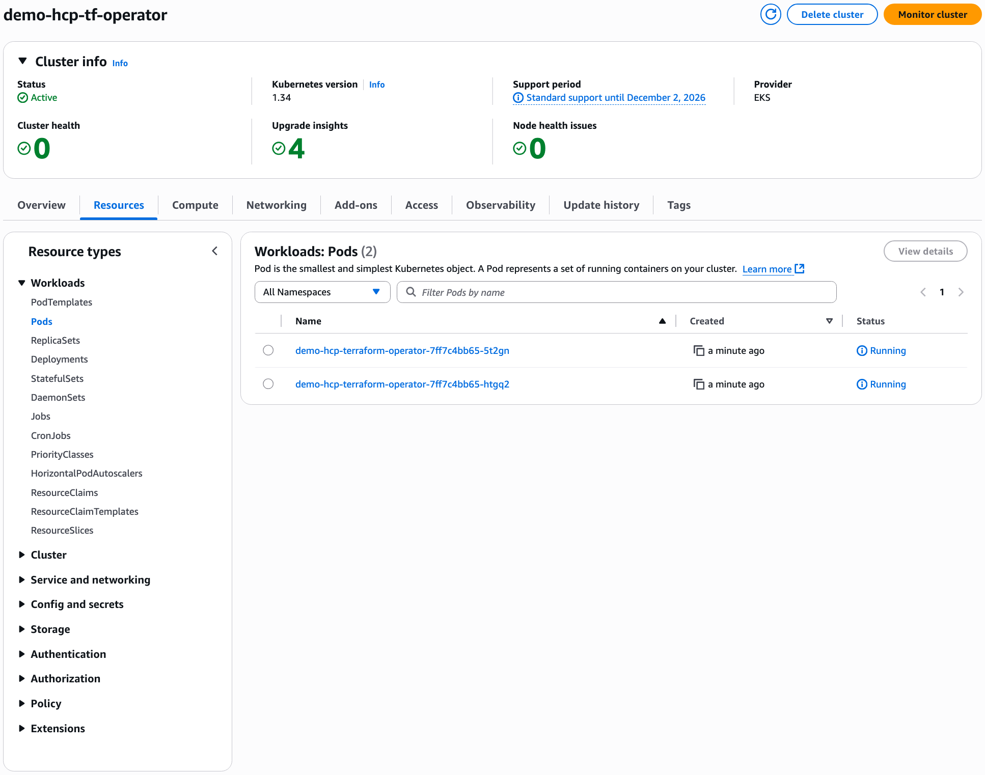 The EKS Cluster now has 2 Terraform Operator pods running.